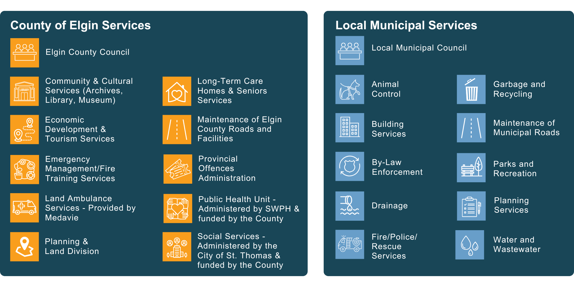 We work closely with our seven local municipalities, which are West Elgin, Dutton Dunwich, Southwold, Central Elgin, Aylmer, Malahide, and Bayham. The breakdown of how services are delivered and how we work together to support our communities can be found in the graphic below.