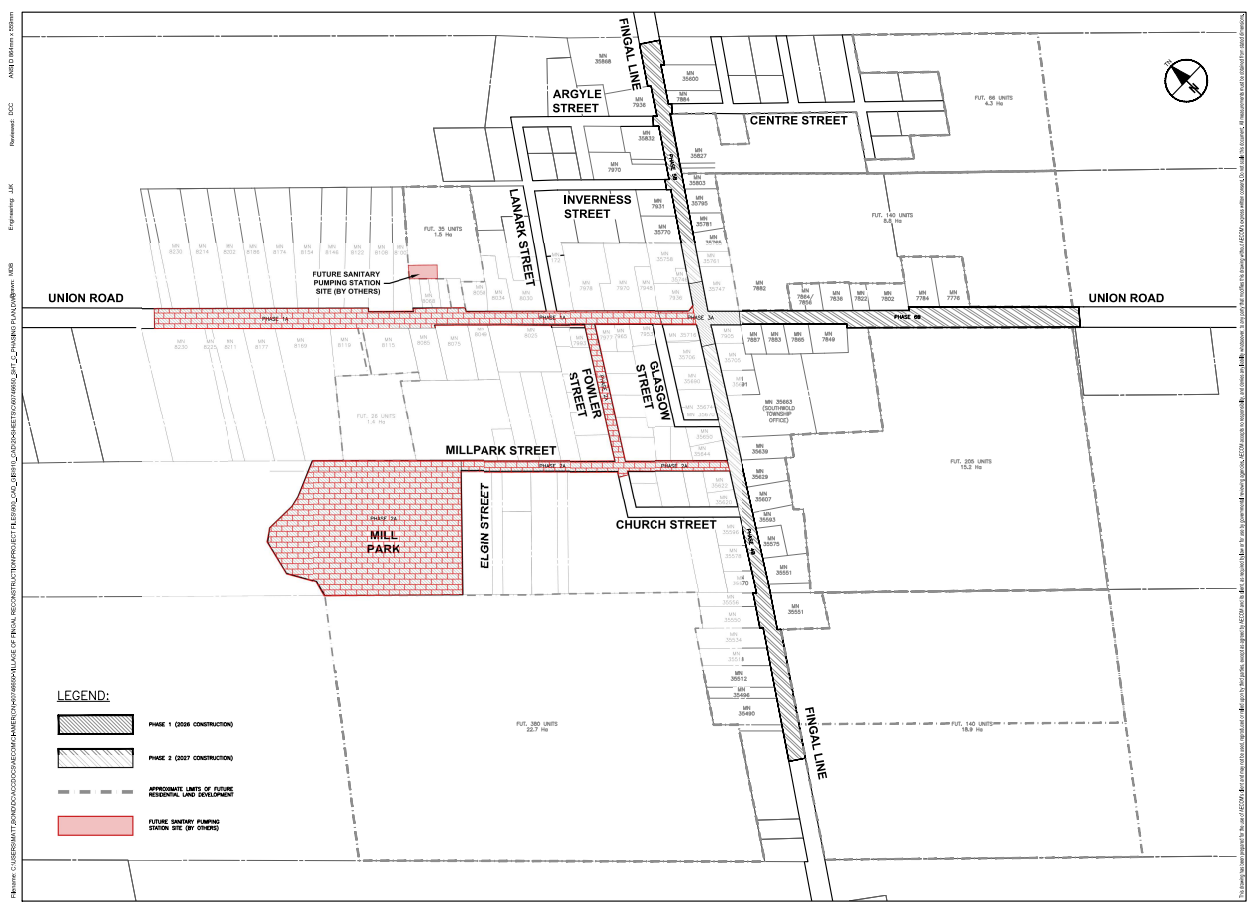 Phase 1A work area is shown in red on the map below, and is expected to take place between November 2025 and May 2026. Construction will focus on Union Road north of Fingal Line, Fowler Street, and Mill (Millpark) Street.